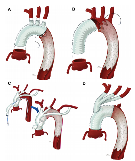 针对胸主动脉瘤和分层的血管修复方案主要有两种,分别是开胸手术和血管腔内介入修复(endovascular aneurysm repair, EVAR)。开胸手术风险较高,需要配合使用体外循环和深低温循环性停搏,术后的死亡率和心肌梗死率分别达到10%和20%[1],其高有创性使得部分病人无法选择这种手术方案。EVAR的有创性较低,术中采用局部麻醉且不中断血流,因此其死亡率和引起并发症的概率较低[2]。然而,EVAR在针对累及主动脉弓的修复时,需要面临弓上动脉被堵住的问题,因此,EVAR的使用可能还需要配合使用开窗术或搭桥来保持弓上动脉的供血。近年来,为了提高术后的短期和长期治疗效果,结合开胸手术和EVAR两种技术特点的手术方案被提出[2],这种技术方案主要包括切除替换主动脉弓和在降主动脉植入支架,图1[3]展示了这种方案的不同执行情况: