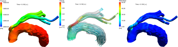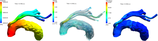 以一例混合技术方案为例,计算术后的血管内部流场。如图2所示,针对该病例,在主动脉弓区域使用了支架撑开血管;为了保证脑部和上肢供血,在升主动脉远端开口,通过人工血管搭接,连接升主动脉和其他血管。从医学图像中提取几何模型并划分网格;根据文献资料或临床数据,在主动脉入口添加流量波形边界条件,在血管出口耦合集中参数模型;设置合理的血液材料参数和选择合适的湍流模型,求解控制方程并计算内部流场。